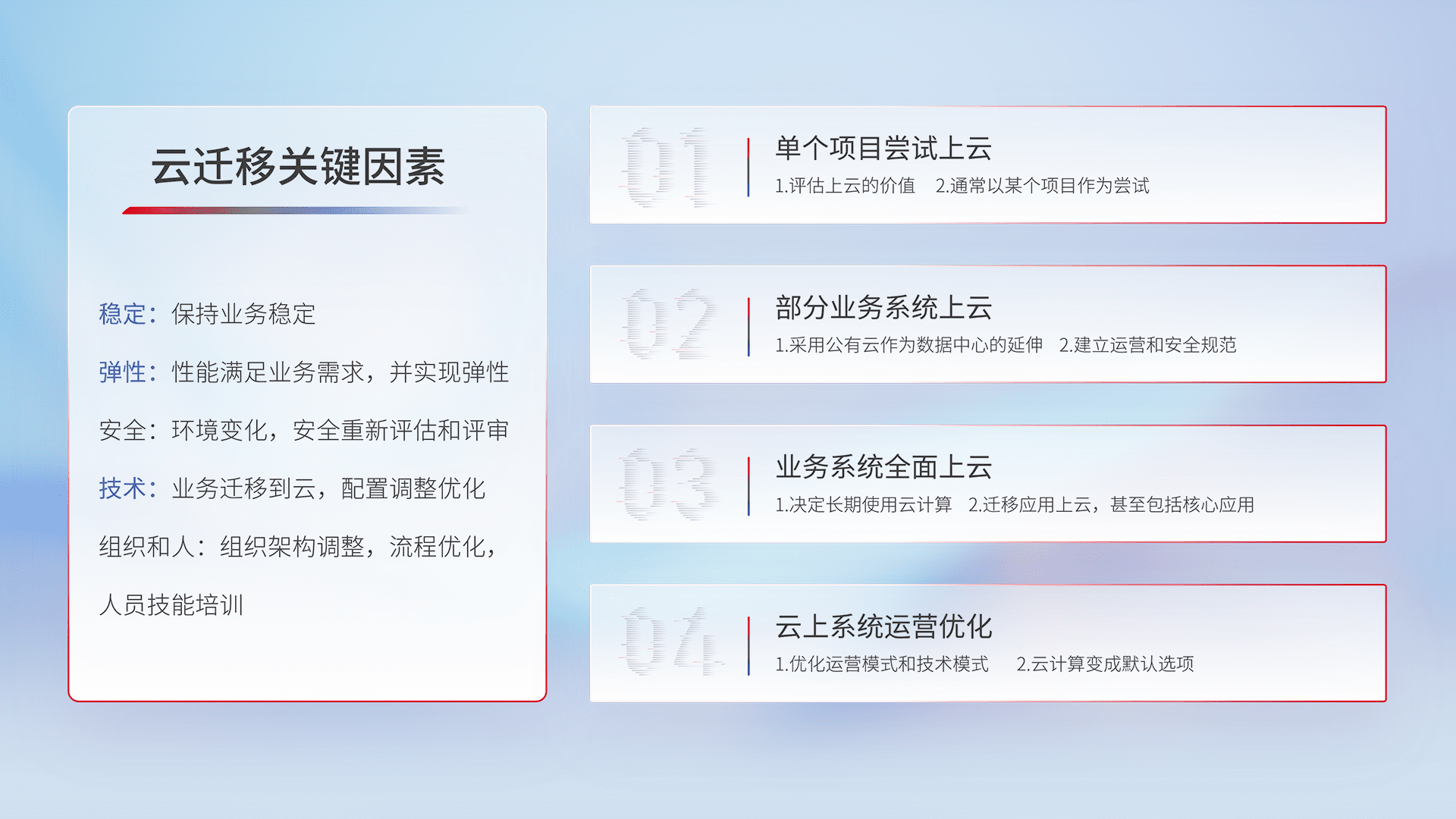 结合实际业务,,,从规划设计、、、云平台选型、、云原生改造、、、数据迁移、、、、集成交付,,迁移全过程为客户识别最佳上云路径,,做好风险识别管理,,,,设计网络架构、、身份权限、、、、安全审计合规、、操作审计、、、、日志审计、、监控告警策略、、多站点容灾设计等,,,,对云上基础设施进行整体规划,,,,提升IT治理水平,,,,以满足弹性、、高可用、、高性能的需求。。。。
