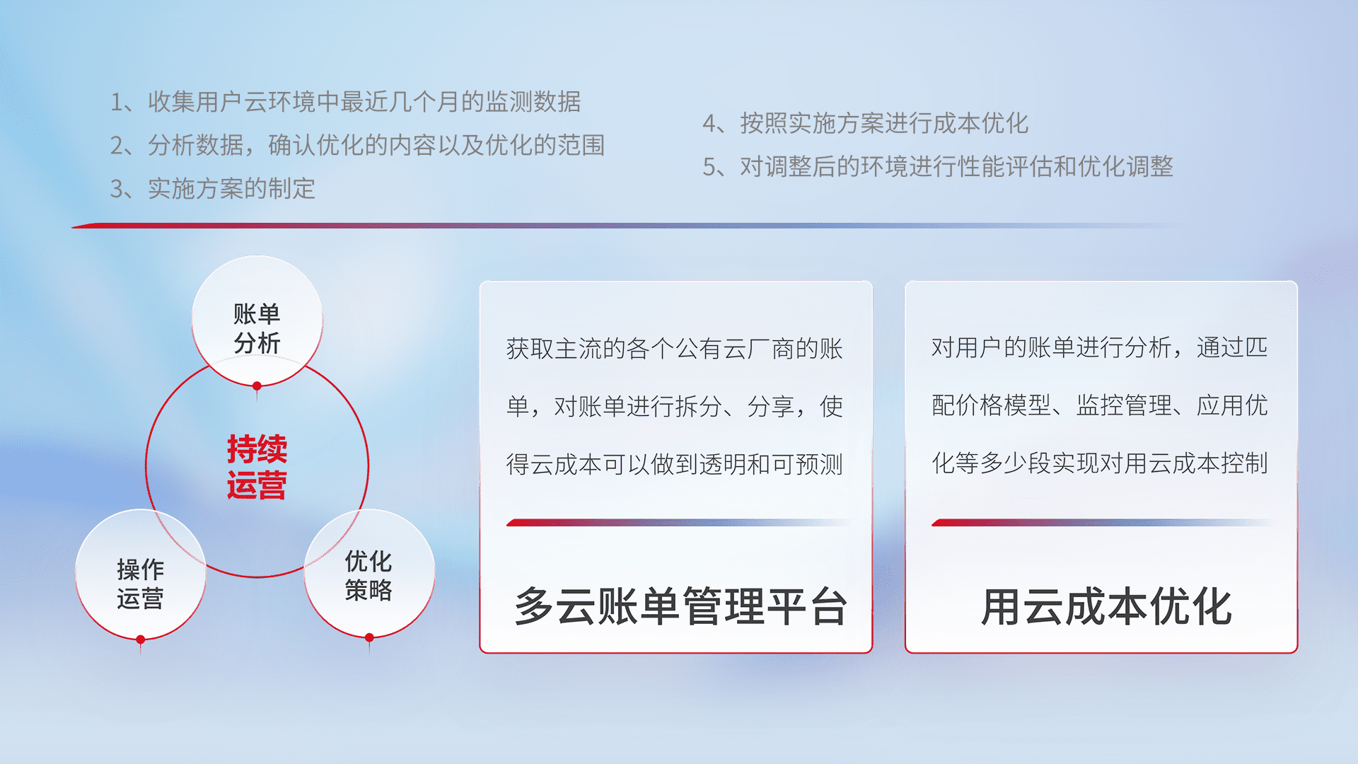 通过多云纳管,,,,以统一的资源数据模型把客户的云资源进行抽象和封装,,,,进而实现对多云资源的统一操作,,,,保障云资源管理的可靠性、、、、稳定性与可用性。。。。量身定制化运维内容,,,,配置、、开发运维、、、补丁管理、、、、备份、、、、监控、、、认证和访问管理、、、审计和日常巡检等,,,,保障在用云过程中的可靠度,,稳定度以及高可用率。。